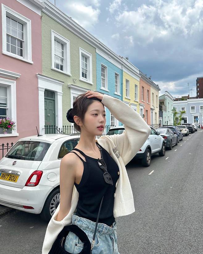 사진 속 장원영은 블랙 나시를 이너로 입고 와이드연청바지와 아이보리 가디건을 입고 내추럴한 캐주얼룩을 선보였다.