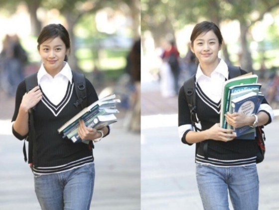 하버드 철자가 새겨져 있는 티셔츠를 입은 김태희. 티셔츠만 입어도 너무 예쁜 건 얼굴이 예뻐서겠죠.