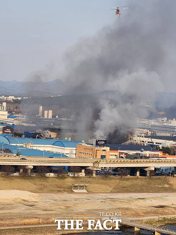 [더팩트ㅣ남윤호 기자] 20일 오후 1시17분께 대전광역시 대덕구 문평동의 자동차 부품공장에서 화재가 발생해 소방헬기가 화재 진압을 하고 있다.