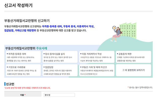 포털 검색창에 '부동산 불법행위 통합 신고센터'만 입력해도 쉽게 접속할 수 있고, 피해 유형별로 구체적인 신고 예시와 절차가 상세하게 정리되어 있어 처음 접하는 사람도 혼자 충분히 신고를 진행할 수 있을 만큼 체계적으로 구성되어 있었다.