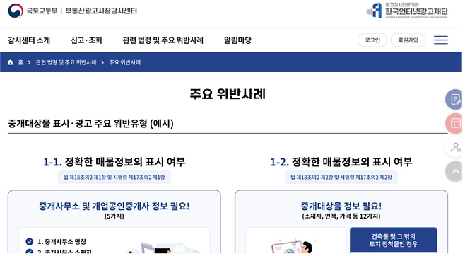 중개대상물 표시 및 광고 주요 위반 사례 소개 페이지