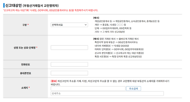 신고 방법은 신고인, 신고 대상인, 신고내용, 입증자료(예: 계약서 사본, 녹취록, 실거래가 자료, 현수막, 온라인 커뮤니티 화면 등)를 작성 후 접수하면 된다.