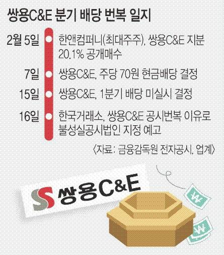 18일 금융투자업계에 따르면 한국거래소는 지난 16일 쌍용C&E에 불성실공시법인 지정 예고를 공시했다. 쌍용C&E는 이달 7일 1분기 배당을 하겠다고 밝혔는데, 15일 돌연 배당을 하지 않겠다고 번복해서다. 불성실공시법인으로 지정되면 거래소에서 벌점을 부과받고 이에 따라 거래정지 등 제재가 있지만 이미 자진 상폐 절차를 밟고 있어 큰 의미는 없다는 평가다.