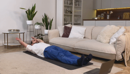 평평한 매트에 누워서 양손을 머리 위로 뻗습니다. 왼손을 공중으로 들어 올리면서 동시에 오른쪽 무릎을 가슴 쪽으로 당깁니다. 이번에는 오른손을 공중으로 들어 올리면서 왼쪽 무릎을 가슴 쪽으로 당깁니다. 이 동작을 번갈아 반복합니다.