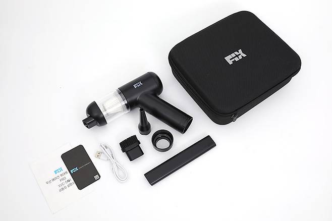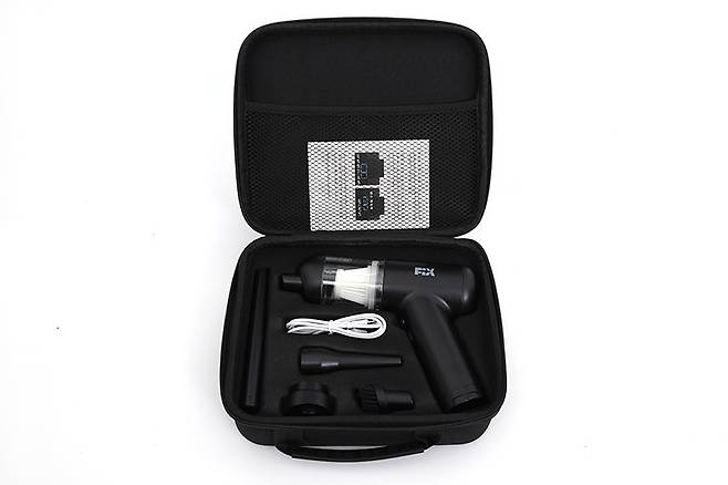 픽스 무선 에어건 휴대용 청소기 PRO XVC-501은 픽스 특유의 블랙+블루 투톤 박스에 담겨있다. 모든 구성품은 세미하드 케이스에 가지런히 들어있기 때문에 보관이나 휴대 시 상당히 간편하다.