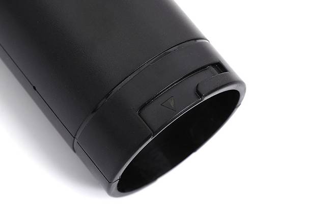 보조배터리 윗면의 원형 체결부와 본체 손잡이 아래쪽을 자세히 보면 삼각형 표시가 있는데, 이 두 삼각형을 맞춰 끼우고 돌리면 배터리팩을 본체에 고정시킬 수 있다.