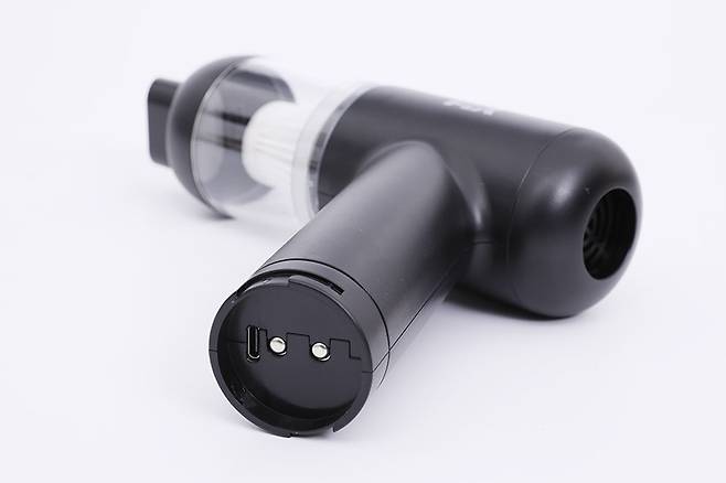 손잡이 아래쪽에는 두 개의 금속 접점이 보이고, USB C타입 포트도 보인다. USB C타입 포트는 본체에 내장된 배터리를 충전할 때 사용된다.