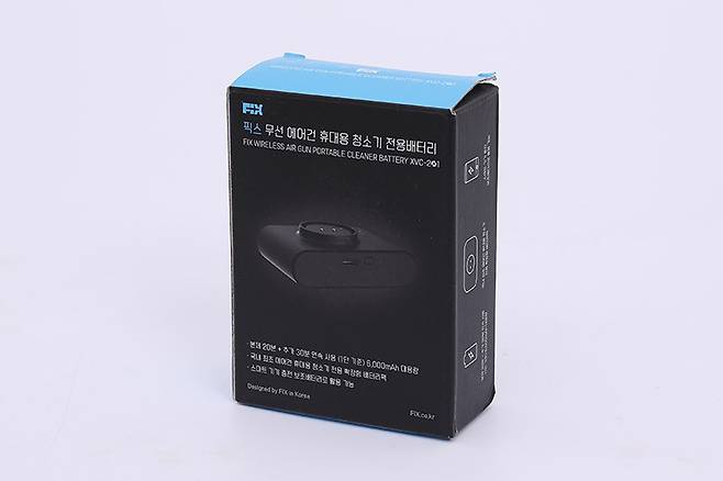 픽스 무선 에어건 휴대용 청소기 PRO XVC-501에는 또 하나의 특별함이 있다. 바로 전용 확장형 배터리팩을 사용할 수 있다는 점이다. 전용 배터리팩은 별도로 구매 가능한데, 본체와 마찬가지로 블랙과 블루 투톤의 박스 패키지에 담겨있다.