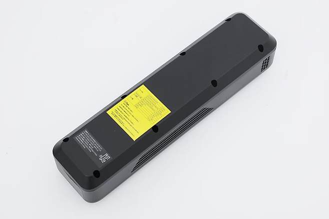 본체 뒷면에는 아래쪽에 제품명과 간략한 사양 및 인증 정보가 인쇄된 스티커가 부착되어 있다. 뒷면 중간쯤에는 눈에 잘 띄는 노랑 스티커도 하나 붙어있는데, 자동차나 자전거, 오토바이, 구기류 등 종류에 따른 대략의 공기압을 안내해주는 내용이 포함되어 있다.