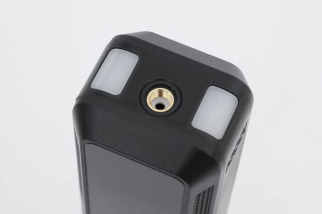 픽스 무선 전동 에어펌프 PLUS XAP-501 본체 윗면에는 가운데 부분에 나사산이 파여있는 구멍이 하나 있는데, 공기주입용 고압튜브를 연결하는 곳이다. 연결구 양쪽에 있는 흰색 부분은 LED가 내장되어 있어서 비상 시 조명으로 사용할 수 있다.