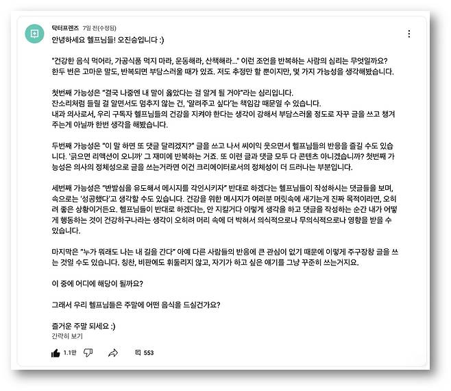 우창윤 교수님은 닥터프렌즈 유튜브 커뮤니티로 구독자의 건강을 걱정하며 음식을 먹지 말라고 하는 모습으로도 유명해.