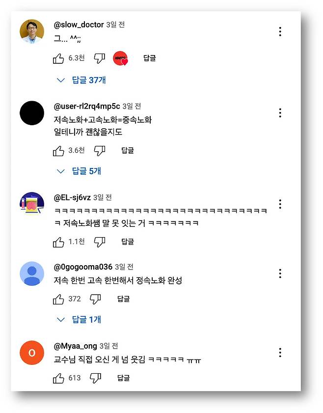 이 숏츠에는 정희원 교수님이 본인등판을 하셔서 할 말 없이 멋쩍게 웃고 가는 모습도 포착되었어. ‘저속 + 고속 = 중속 노화’, ‘저속 한 번, 고속 한 번 해서 정속노화 완성’이라는 센스 만점 댓글이 달리며 재재표 현실 타협 건강 루틴을 응원했지. 💪