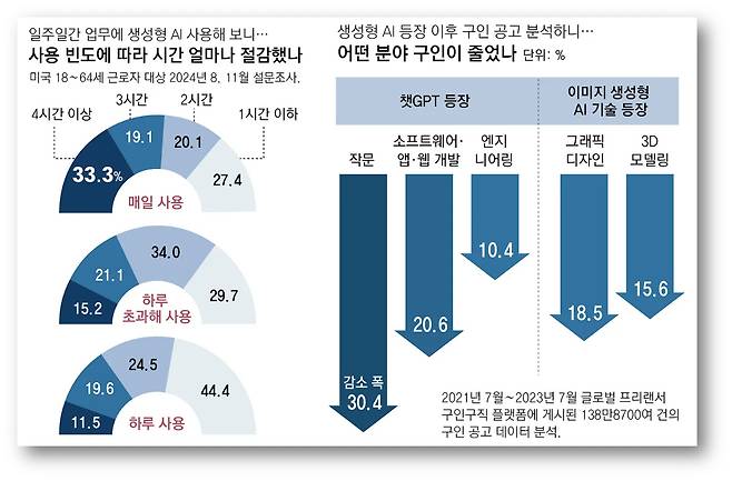 미국 1864세 근로자 대상으로 한 설문조사에 따르면 생성형 AI를 업무에 활용한 근로자들은 시간 절감 효과를 경험했대. 특히 매일 생성형 AI를 사용하는 근로자의 경우 33.3%가 ‘4시간 절약했다’고 응답해 사용 빈도가 높을수록 시간 절감 효과가 매우 큰 것으로 분석됐지. 이는 전체 근로시간을 기준으로 환산했을 때 생성형 AI 사용자가 평균적으로 주당 5.4%의 시간을 절약한 셈이라고 해.