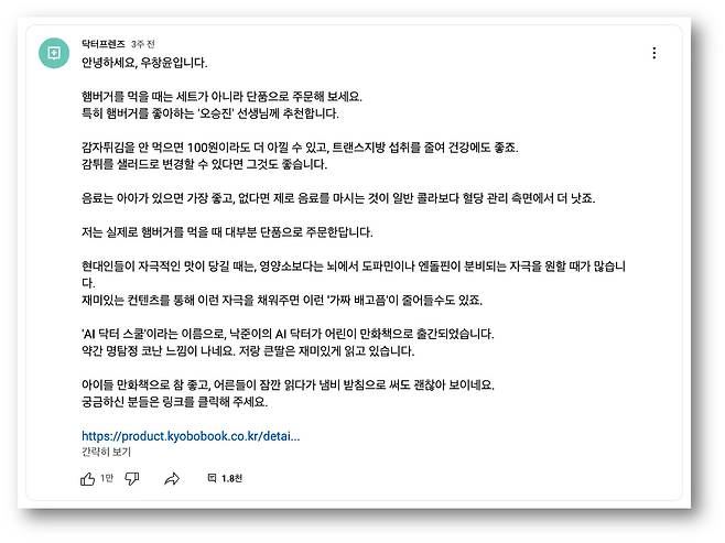 우창윤 교수님이 또 건강식을 추천하자, “이쯤 되면 왜 저런 글을 자꾸 쓰는 걸까?”라는 글을 남기며 살~짝 놀리는 듯한 분석글을 올렸어. 닥터프렌즈만의 케미가 돋보인다며 결국 햄버거 세트를 시켜먹었다는 댓글이 달리고 있지 🤣