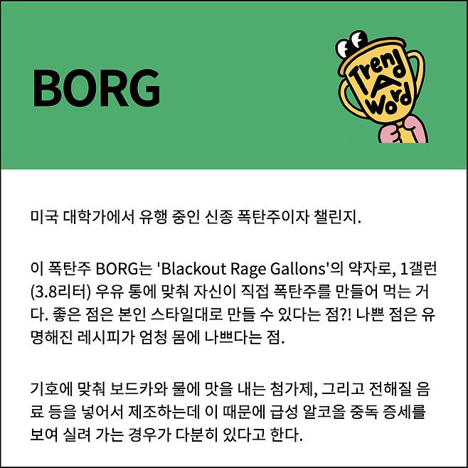 이 때 BORG라는 술을 직접 만들어서 들고나가 파티 하는 것이 문화가 되어버린 것!