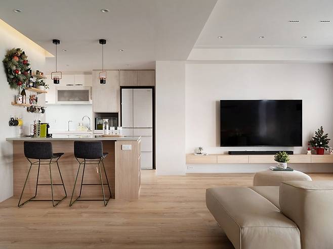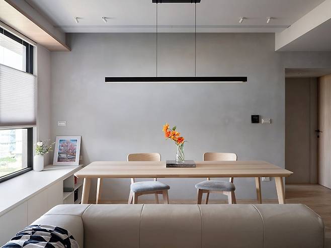 소파 뒤로는 원목 식탁을 두어리빙존과 다이닝존이 자연스럽게 이어진다.벽 대신 시선이 통하니 가족 간의 대화도 훨씬 부드러워졌다.