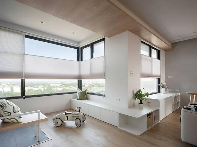 탑다운 허니콤 블라인드는빛의 양을 조절하면서도 프라이버시를 지켜주는 실용적인 선택.창가 아래에는 수납 겸 벤치를 만들어앉거나 물건을 정리할 수 있는 다용도 존을 완성했다.