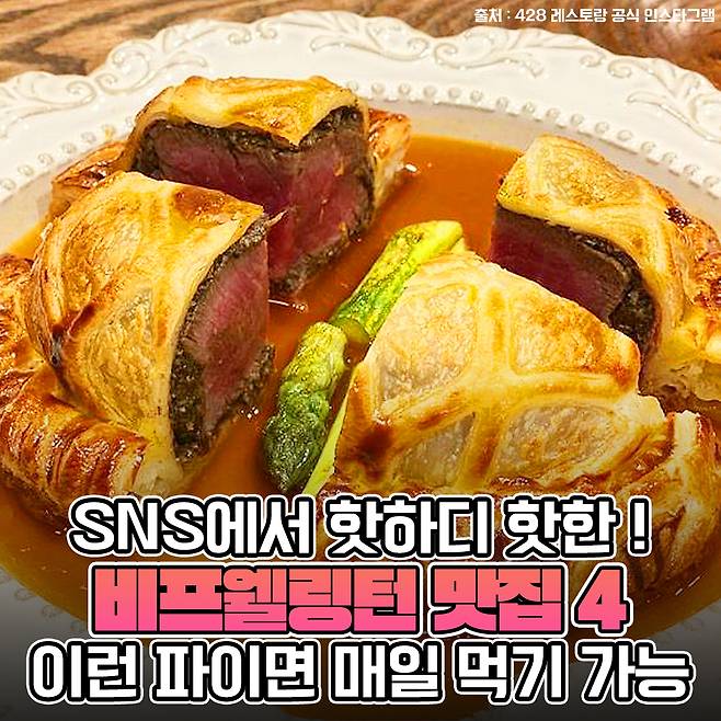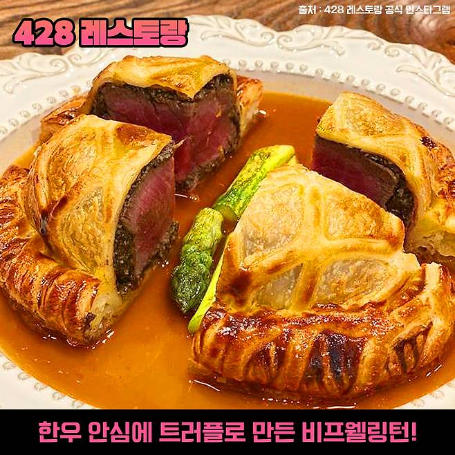428 레스토랑의 시그니처 메뉴인 비프웰링턴은 부드럽게 숙성시킨 한우 안심에 트러플과 다양한 버섯으로 만든 뒤셀을 감싸 만든 영국식 파이인데요~