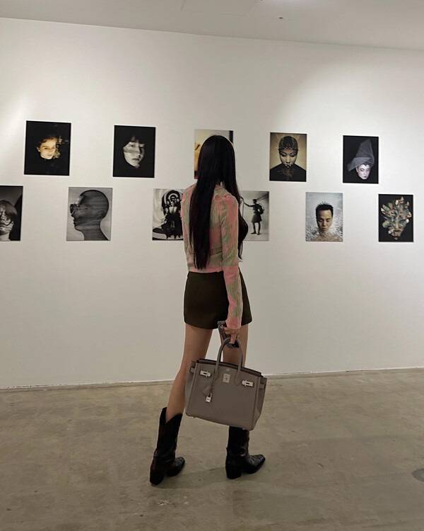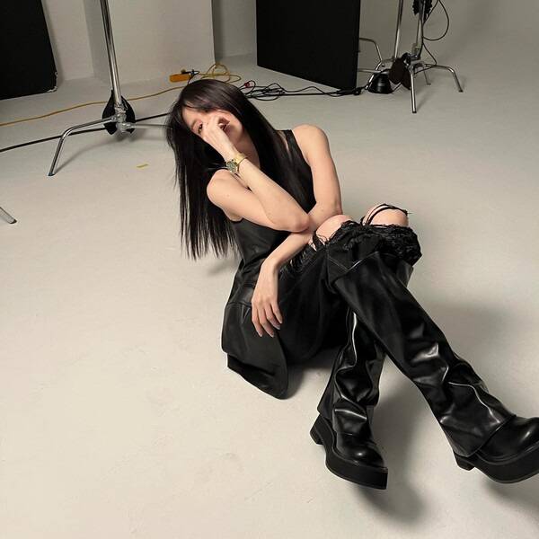 레더 워머를 신은 듯한 착각을 불러일으키는 블랙 와이드 부츠를 착용한 배우 한소희.
