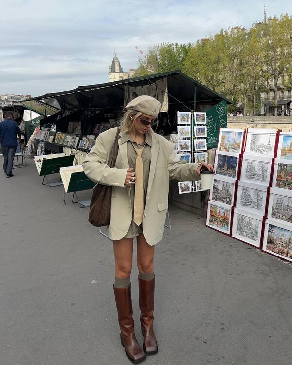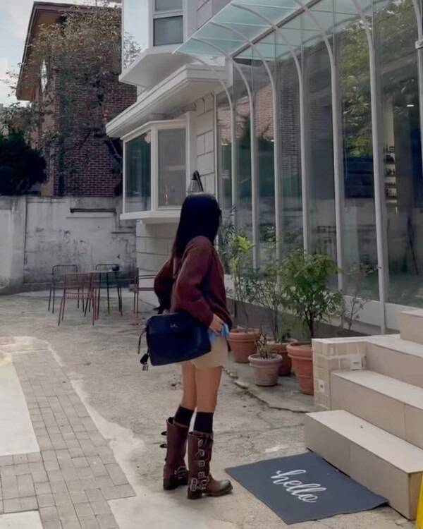 디테일이 많은 부츠를 활용하기 보다 담백한 디자인의 브라운 계열의 롱 부츠에 카키색 니삭스를 더해 멋스러운 스타일을 연출했다.