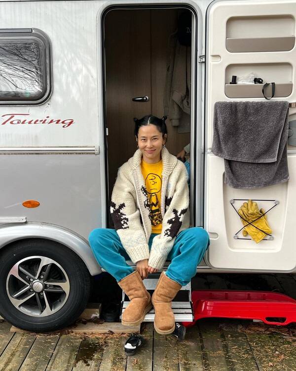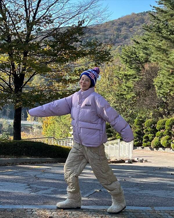 김나영은 포근한 빈티지 니트 집업과 채도 높은 트레이닝 팬츠에 어그를 매치하여 발랄한 소녀 감성을 한껏 끌어올렸다. 또 다른 사진은 파스텔 톤의 패딩과 패딩 바지, 그리고 털 부츠를 착용하여 단단한 겨울 준비에 들어선 모습이다.