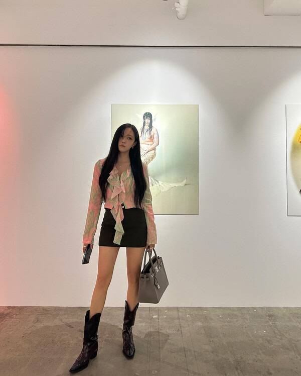 빈티지한 컬러에 러플 디테일이 더해진 블라우스, 미니 스커트에 블랙 웨스턴 부츠를 착용하여 옷과 부츠의 반전 매력을 뽐냈다.