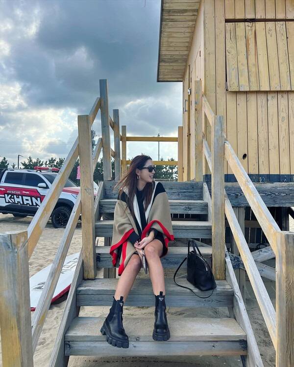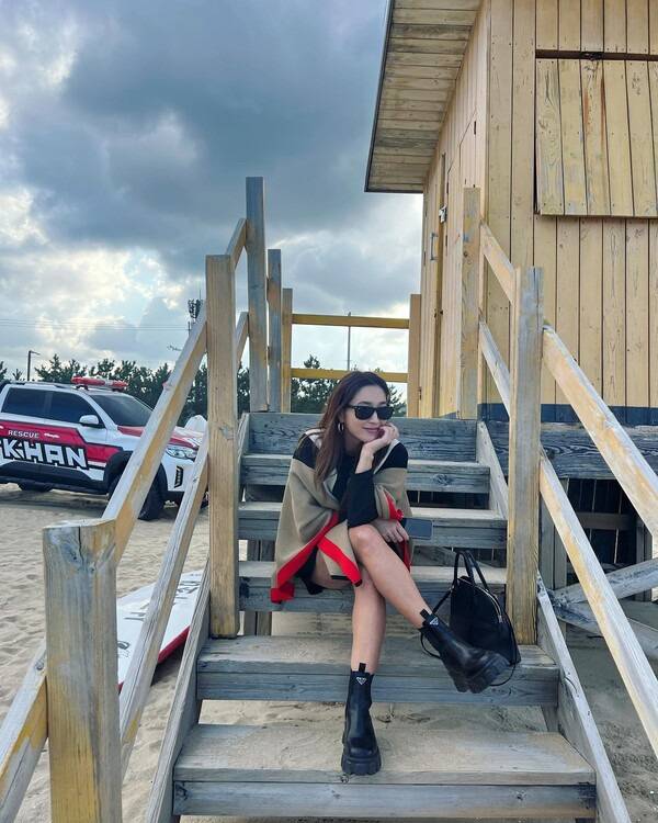 배우 이민정은 심플한 블랙 룩에 판초 케이프 스타일의 캐시미어 니트를 입어 여유로운 실루엣의 패션을 선보였다. 거기에 유니크한 모놀리식 디자인과 모던하면서 맥시한 느낌의 아웃솔을 가진 앵클 부츠를 착용하여 캐주얼하면서 시크한 무드를 자아냈다.