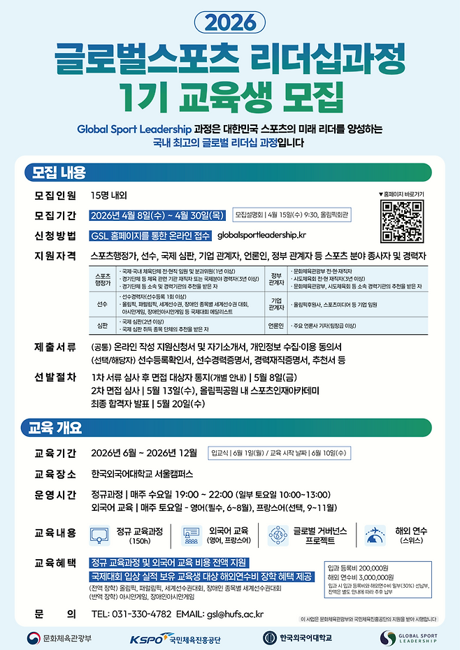이번 교육과정은 오는 6월부터 12월까지 한국외국어대학교 서울 캠퍼스에서 운영된다. 교육생으로 선발된다면 6월 1일 입교식을 시작으로 글로벌 스포츠 거버넌스와 외교, 국제 협력·마케팅·이벤트 운영, 인공지능(AI) 기반 스포츠 이벤트 등 역량 강화를 위한 교육과정을 지원받을 수 있다. 또, 한국외대 외국어연수평가원을 통해 영어와 제2외국어(프랑스어)의 집중 연수 기회도 받는다.