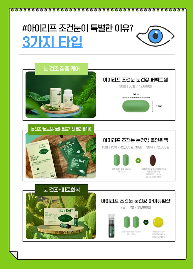 아이리프 조건눈 눈건강 시리즈는 전체적인 눈건강과 함께 안구건조증 케어에 오롯이 집중되어있는 영양제다. 그도 그럴 것이, 건조함을 해결하면 자연스럽게 안구의 컨디션은 회복될 수밖에 없다.