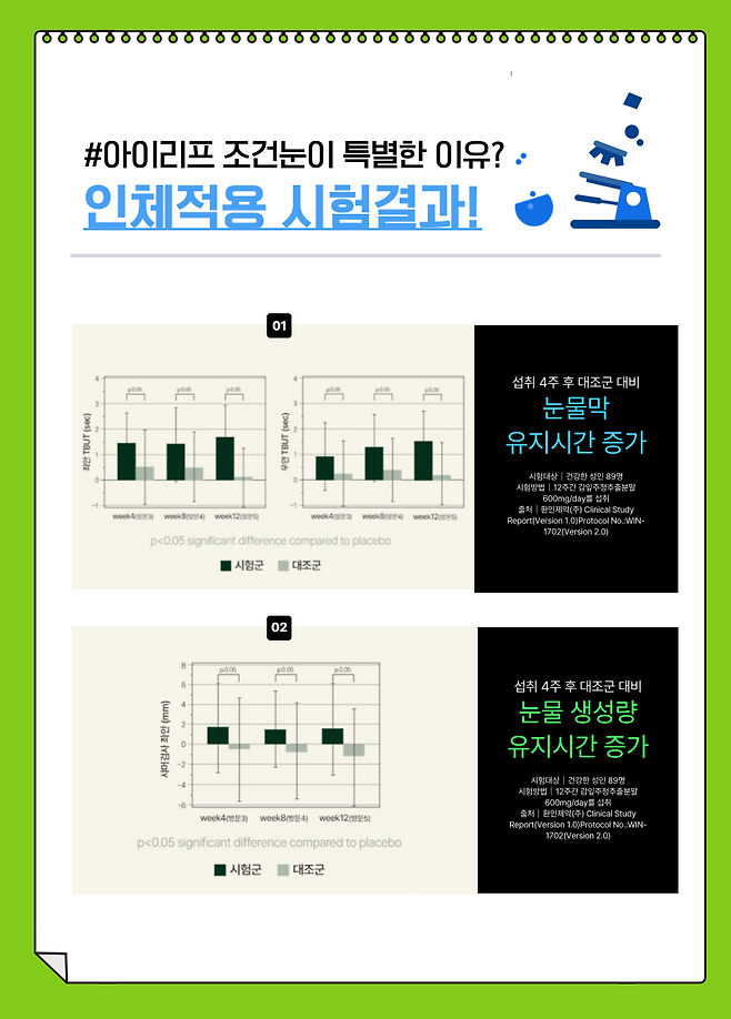 성인 89명을 대상으로 진행한 임상실험에서 눈물막 유지시간, 눈물 생성량 유지시간을 꾸준히 증가시켜 단 12주 안에 건조함이 해결되고 보통의 건강한 눈 상태로 회복된 것을 볼 수 있다. 눈의 건조함이 해결되니 안구표면 결손 정도 역시 유의적으로 감소한 것을 확인할 수 있었다.