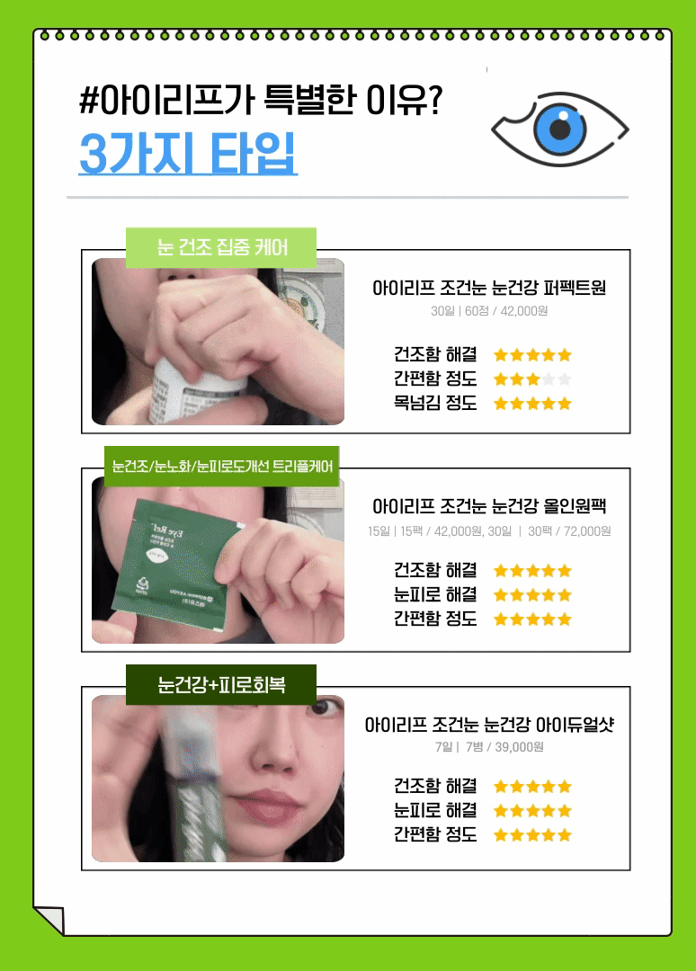 실험결과에서도 확인할 수 있듯이 아이리프 눈건조 영양제는 인공눈물, 루테인, 오메가3처럼 평생 먹는 영양제가 아니다. 눈건조 개선을 목표에 두고 약4주 정도만 잘 챙겨먹어도 충분히 효과를 볼 수 있다.
