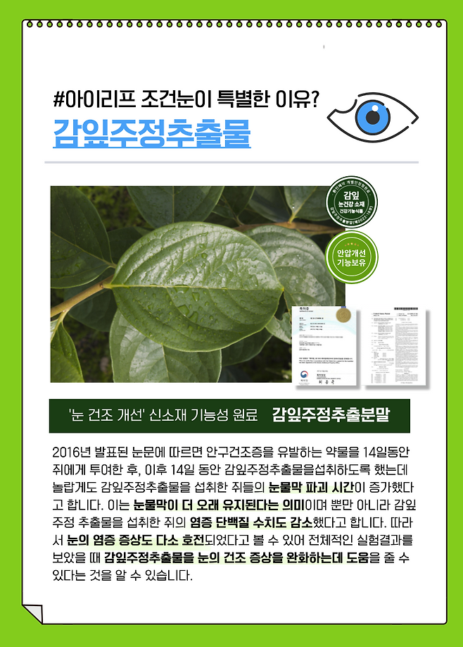 감잎주정추출분말은 안구건조증 뿐 아니라 전체적인 눈 건강 케어에 가장 뛰어난 효능을 자랑하며, 환인제약 아이리프 조건눈 눈 건강 시리즈는