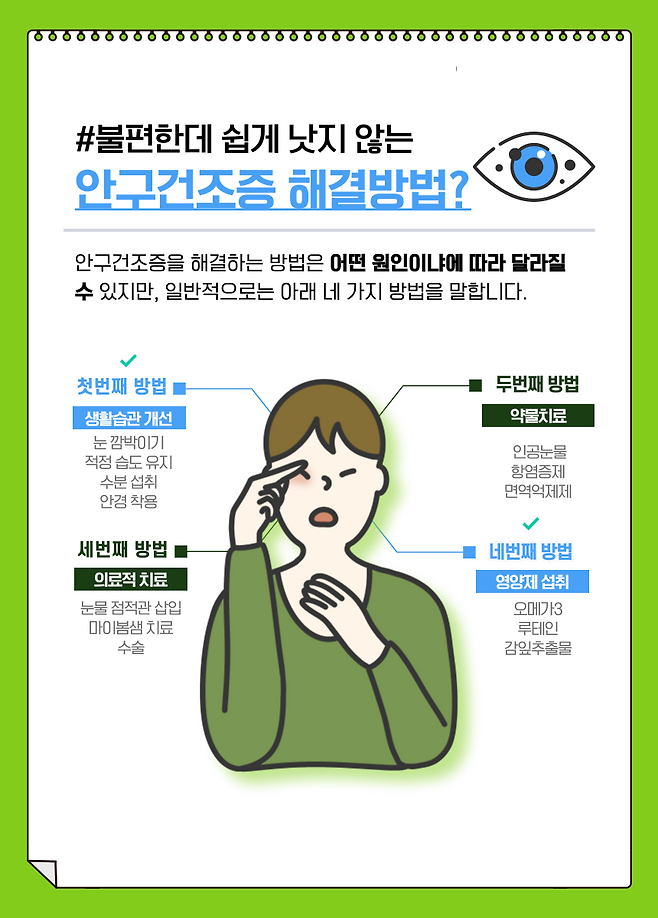 그렇다면 안구건조증을 해결할 수 있는 방법은 뭐가 있을까?
