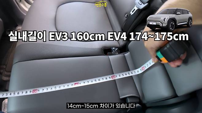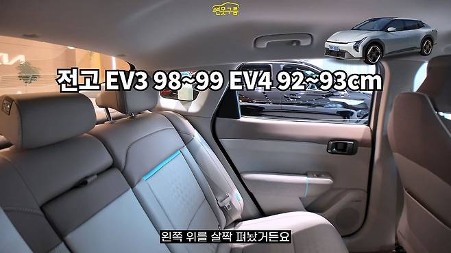 2열 실내 전고는 두 모델 모두 약 92cm로 측정되었으나, EV3는 SUV 특성상 시트 위치가 더 높아 앉은키가 큰 탑승객에게 유리할 수 있다.