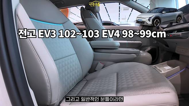 EV3가 102~103cm로 EV4(98~99cm)보다 3~4cm 높은 것으로 나타났다. 다만 EV4는 시트 높낮이 조절 범위가 더 넓어 시트를 낮게 설정할 수 있는 옵션을 제공한다.