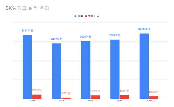 1일 SK텔링크의 감사보고서에 따르면 2024년 연간 매출은 3418억원을 기록하며 전년 대비 10.6% 늘었지만 영업이익은 132억원으로 34.9% 줄었다. 영업이익이 꺾인 건 비용 부담이 커졌기 때문이다. 해외발신정산료가 2023년 843억원에서 지난해 1010억원으로 뛰었다. 외주 용역비도 133억원에서 216억원으로 늘었다.