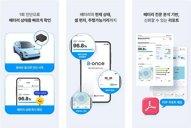 비원스는 단 한 번의 진단으로 배터리 잔존 용량, 전압, 온도 등 핵심 정보를 빠르고 정확하게 파악할 수 있으며, 진단 방식에 따라 최대 5분 내 진단 가능한 '퀵 스캔', 충전 데이터를 기반으로 한 정밀 진단 '파워 스캔' 두 가지 방식이 제공된다. 진단 결과는 전용 앱을 통해 실시간 확인 가능하며, 시각화된 리포트 형태로 배터리 성능 및 상태 정보를 제공한다.