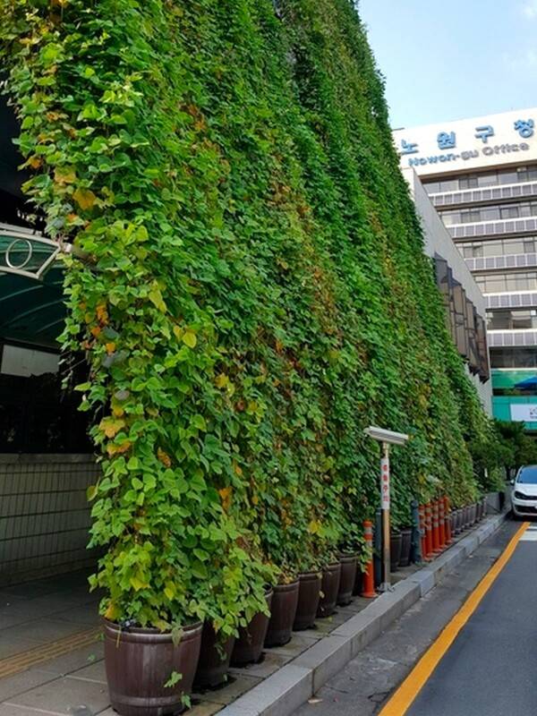몇 해 전 서울 노원구청에 녹색커튼을 설치해준 적이 있다. 회색빛 시멘트에 페인트를 칠해도 여전히 삭막하니 '대안을 찾아보자'고 구청 내부 논의가 있었다고 했다. 필자는 이런 소식을 접하고 '녹색커튼'을 제안했다.