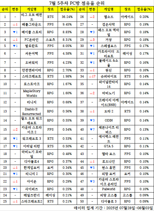 한 주간의 PC방 순위를 되짚어 보고, 어떤 변화가 있었는지 알아보는 'PC방순위' 코너입니다. 데일리게임은 매주 PC방 순위를 일목요연하게 정리, 독자들이 알아보기 쉽도록 제공합니다. 지난 한 주간 어떤 PC 온라인게임들이 눈길을 끌었는지 살펴봤습니다. < 편집자주 >
