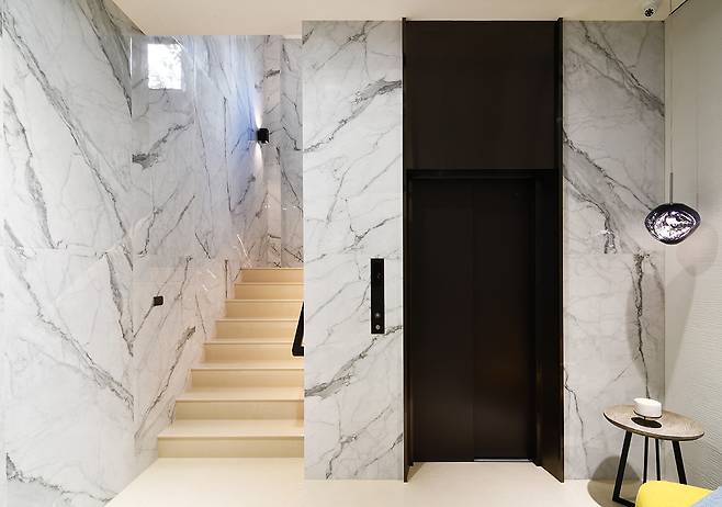 문을 열면 은은한 회색 톤의 실버 폭스 타일이 차분히 반기고, 벽돌은 엘리베이터와 현관 벽을 감싸며 부드러운 빛을 품어낸다.