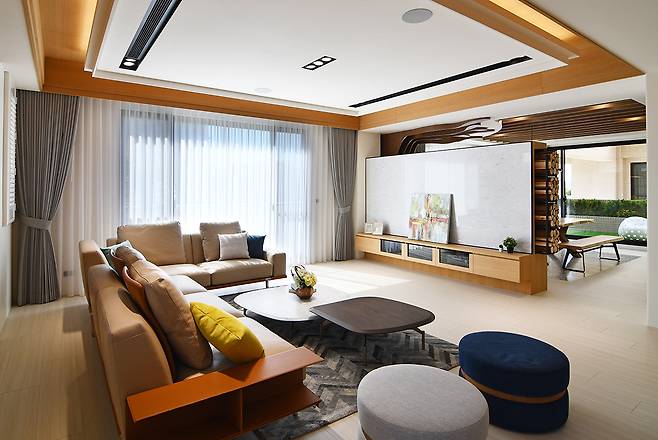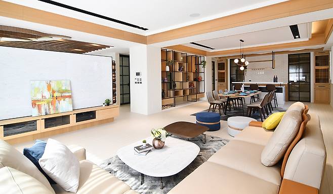 창에는 흰색 블라인드가 걸려 빛과 그림자를 정제하고, 소파 뒤편의 원목 캐비닛은 검은 격자 패턴과 함께 공간의 수직과 수평을 균형 있게 다듬는다.
