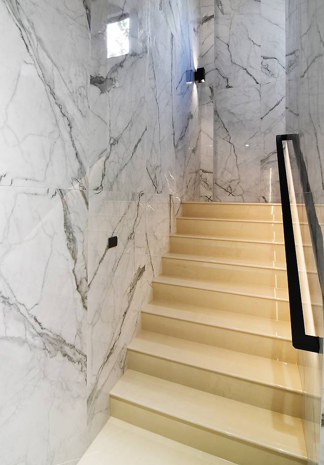 난간에 통합된 선형 조명은 길을 따라 빛의 방향을 제시하고, 집의 성격을 은근히 드러낸다. 첫 걸음부터 이곳은 단순한 통로가 아니라 집 전체의 리듬을 예고하는 무대다.