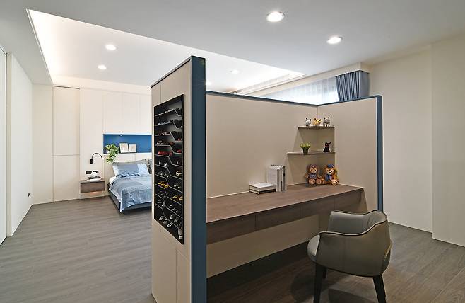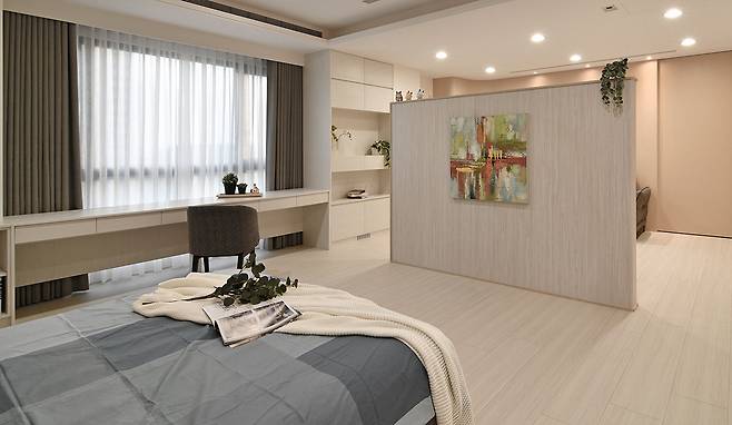 넓은 전망을 향해 열린 침실은 원목 TV 벽으로 따뜻함을 강조하고, 시스템 패널 헤드보드는 빛과 바람을 담아낸다. 슬라이딩 도어 너머엔 갤러리 같은 서재가 펼쳐져, 검은 패널과 대리석, LED 조명이 주인의 예술적 기호를 차분히 드러낸다.