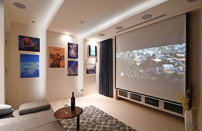 구석의 시청각실은 U자 패널이 벽을 감싸 영화관 같은 깊이를 만들어낸다. 장비는 은밀히 숨겨져 화면과 사운드만 집중된다.