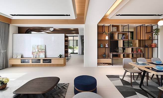 계단을 오르면 블랙 메탈과 원목이 어우러진 캐비닛이 시야를 열어준다. 메인 TV 벽은 옥돌로 마감되어 독서 공간과 느슨하게 이어지고, 천연 목재 프레임은 들보의 압박을 완화하며 따뜻한 색감을 남긴다.