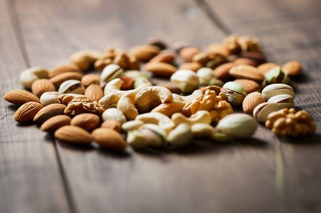 커피를 마실 때 호두, 아몬드, 땅콩 등 견과류 한 줌을 함께 섭취하면 좋습니다.