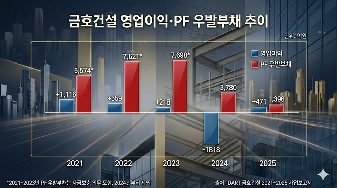 금호건설이 지난해 영업이익 흑자를 기록했지만 부동산 PF 관련 재무 부담이 지속되고 있다. 우발부채 잔액은 1395억원, 책임준공 미이행 시 채무인수로 전환되는 대출잔액은 5306억원에 달한다. 대출 만기가 15년 넘은 일부 사업장은 아직 정리되지 않았다. 금호건설 재무 건전성 회복의 핵심은 PF 우발부채와 책임준공 연계 대출의 정리 속도다.