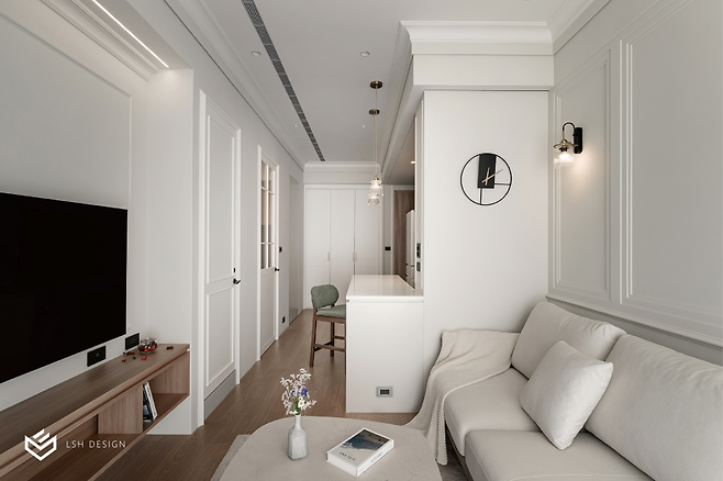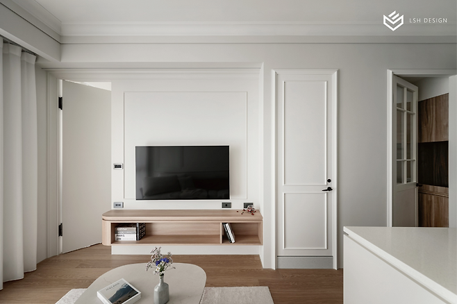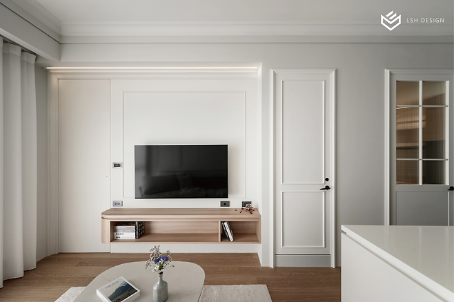 몰딩 라인을 따라 매끄럽게 연결되는 히든도어는 시선을 방해하지 않아 거실이 한층 넓어 보이는 효과를 줍니다.