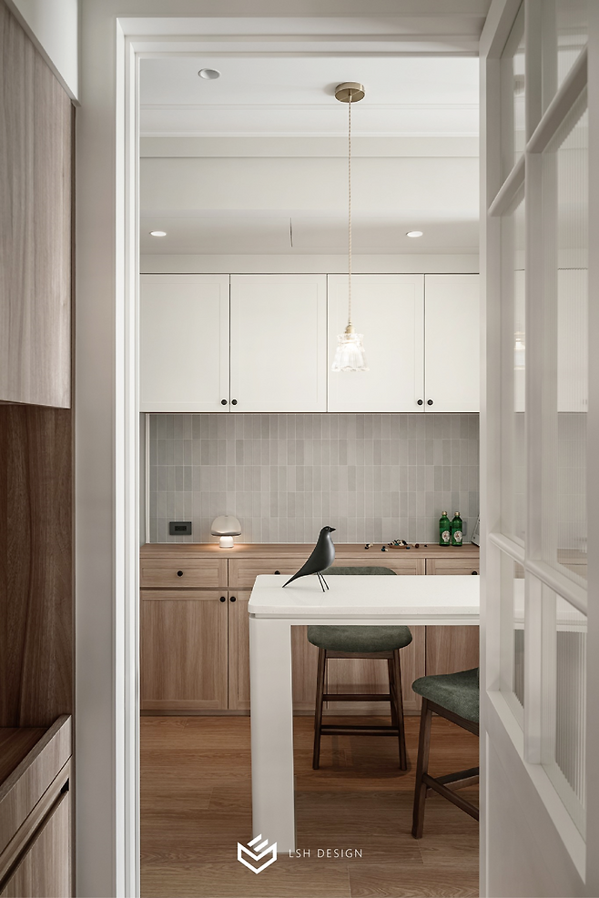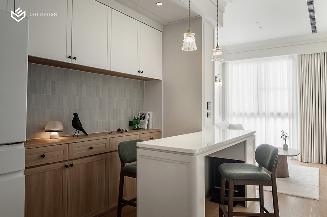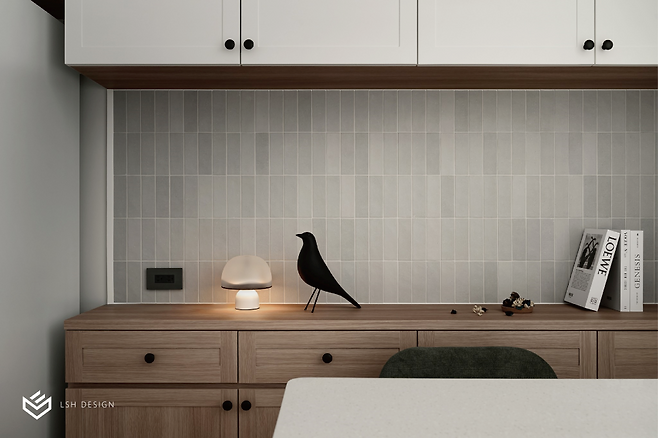 홈바 뒤편에는 홈카페 수납장이 자리하는데요, 그레이 세로 타일이 화이트 상부장과 우드 하부장을 차분하게 연결해줍니다.