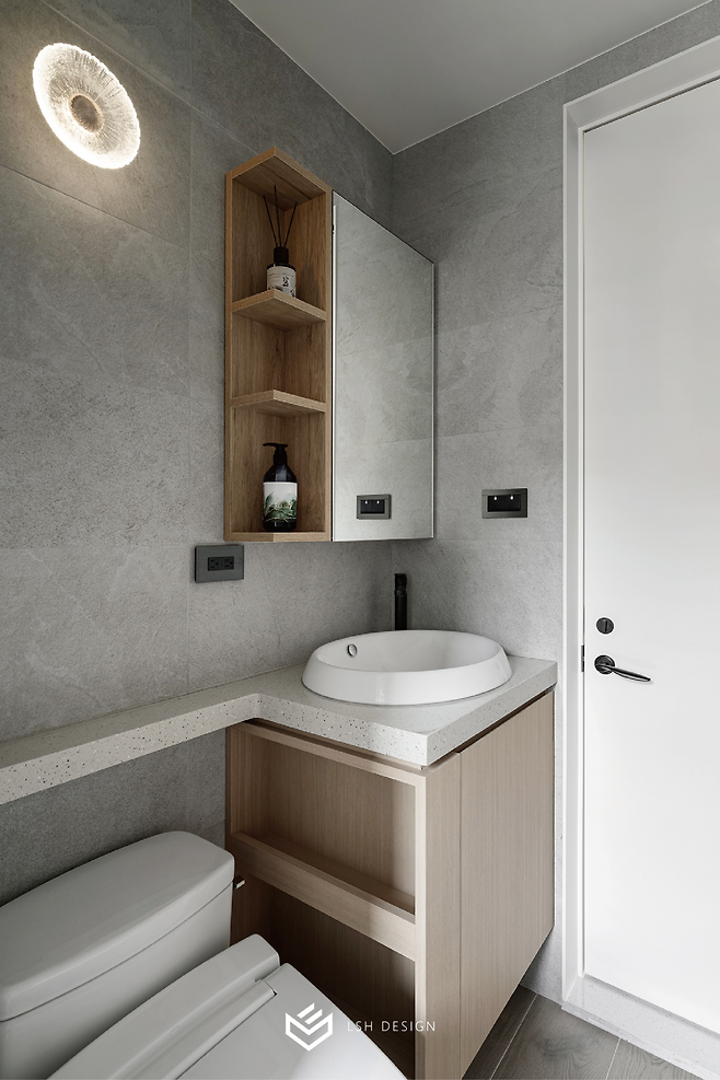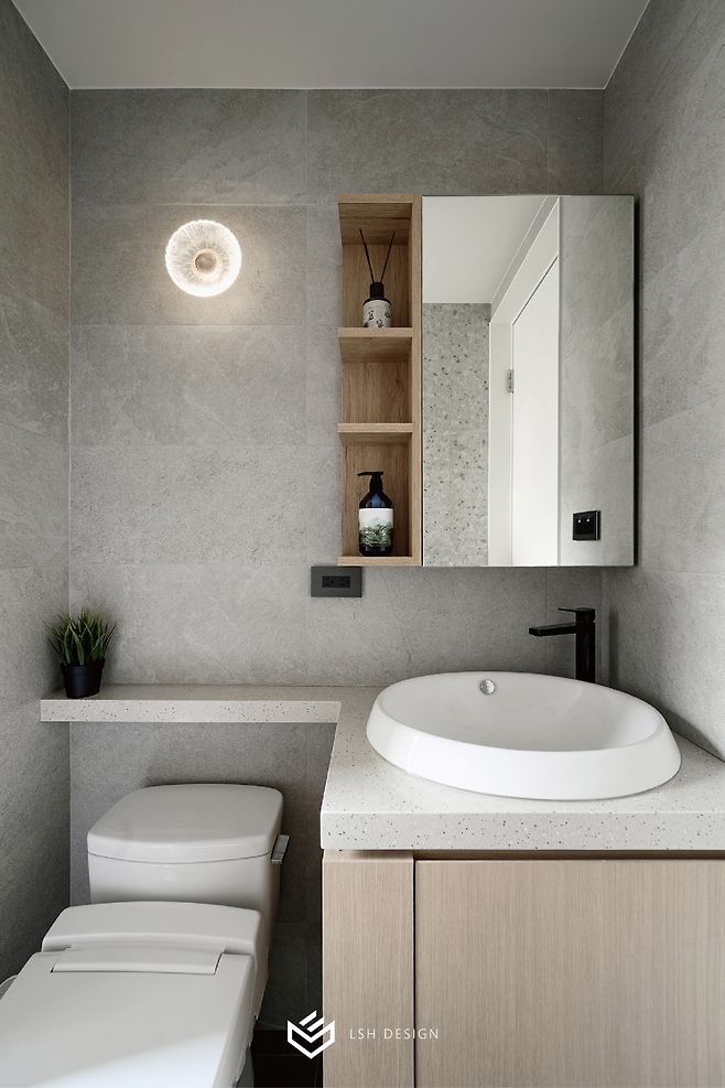 무광 그레이 테라조 타일로 마감한 벽면은 모던하면서도 따뜻한 느낌을 주며, 세면대 위 간접조명은 하루의 피로를 풀어주는 힐링의 시간을 선사할 것 같아요.